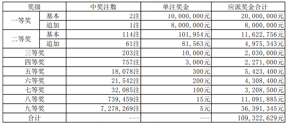 本期二等奖开出114注,61注为18.3万多元的追加二等奖,每注含8.1万多元的追加奖金;53注为10.1万多元的基本二等奖。