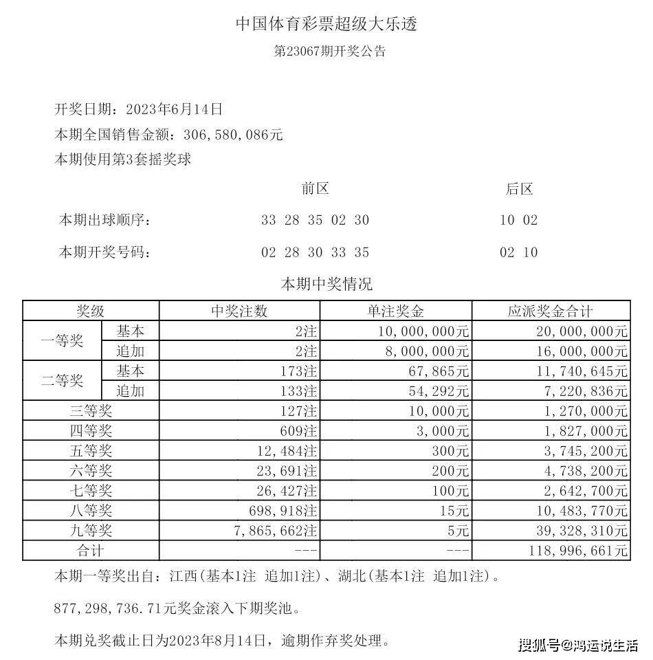 大乐透23067期开出2注追加一等奖快3彩票投注与开奖数据查询每注奖金为1800万元!花落2省